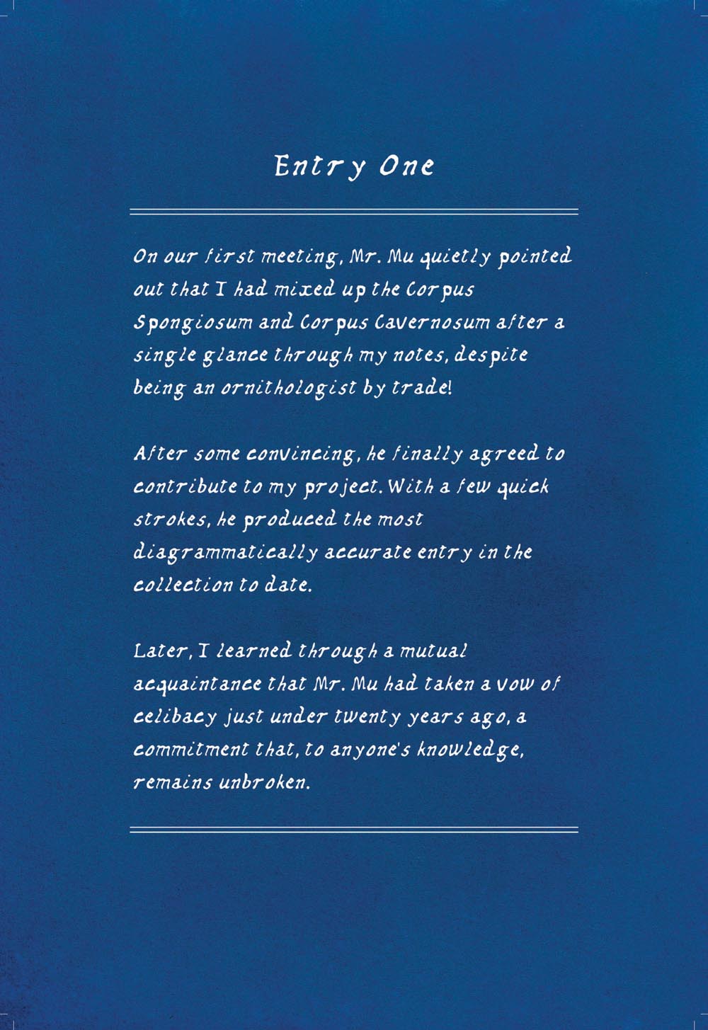 Originally an attempt to escape from far reaching influence of Anna Atkins on the cyanotype genre, this collection of anatomical illustrations hold no practical value as scientific references. Instead, each image is informed purely by the whims of the illustrator, who were chosen at random from all walks of life.